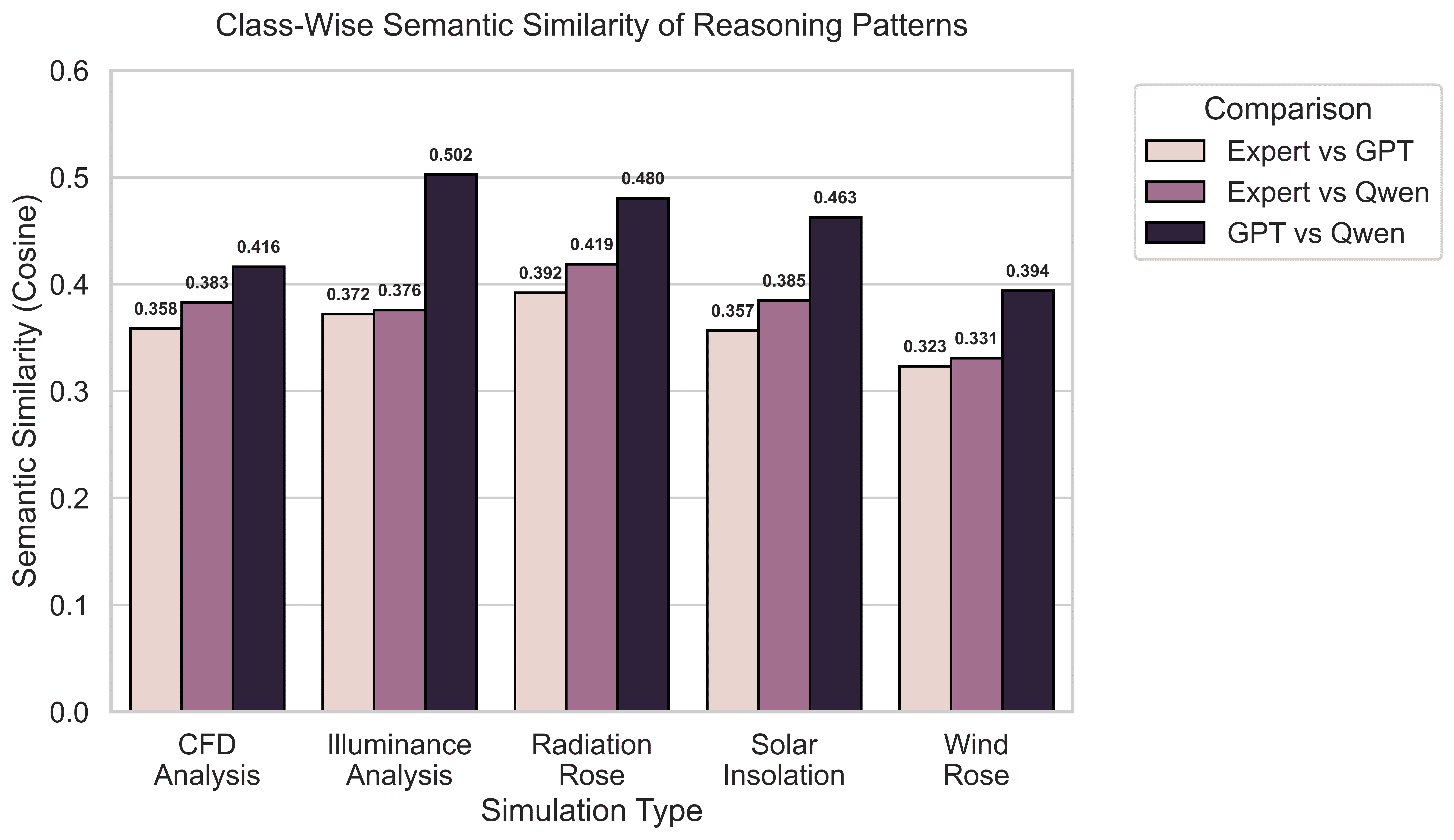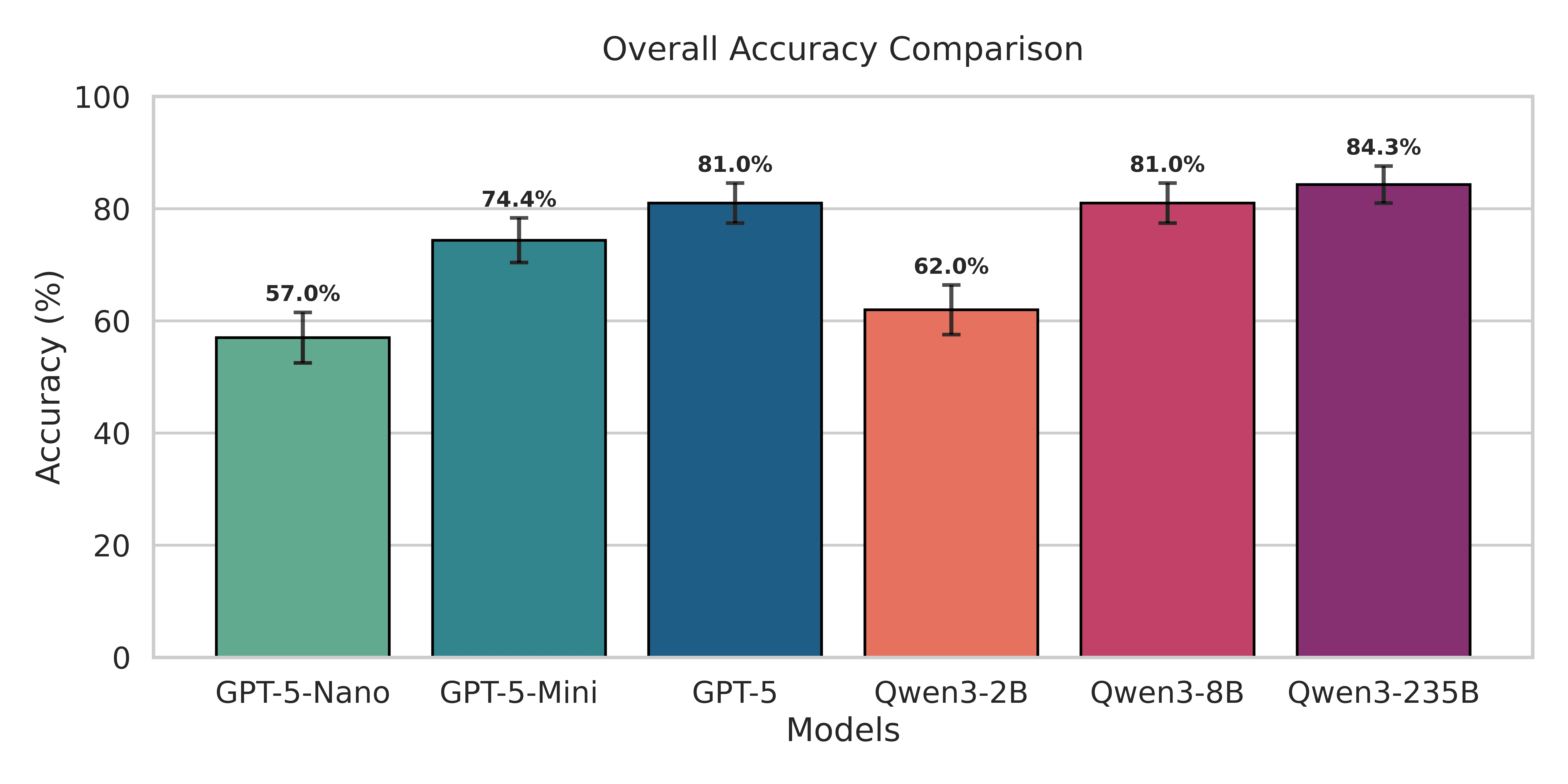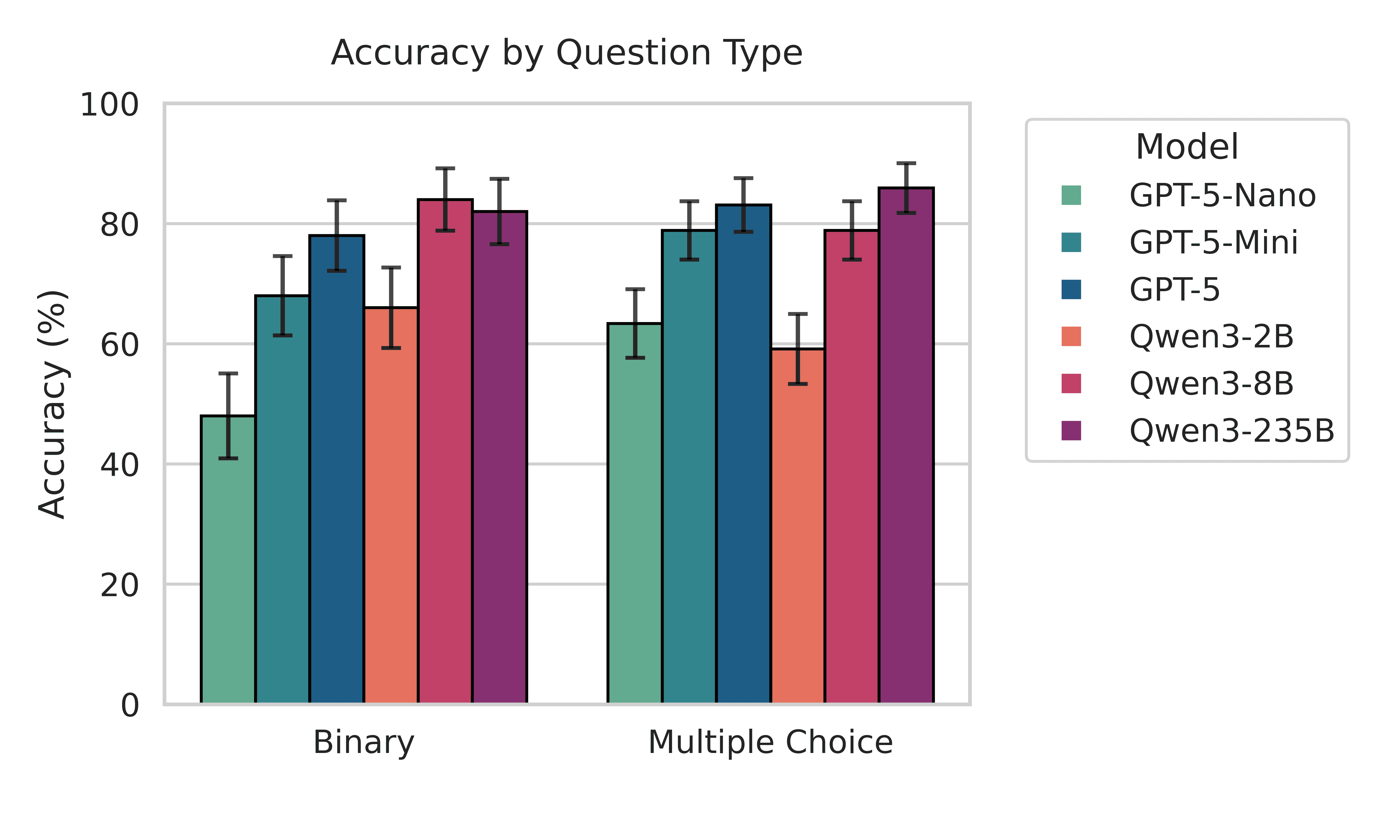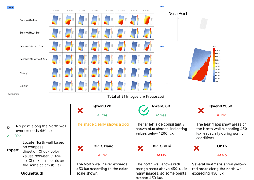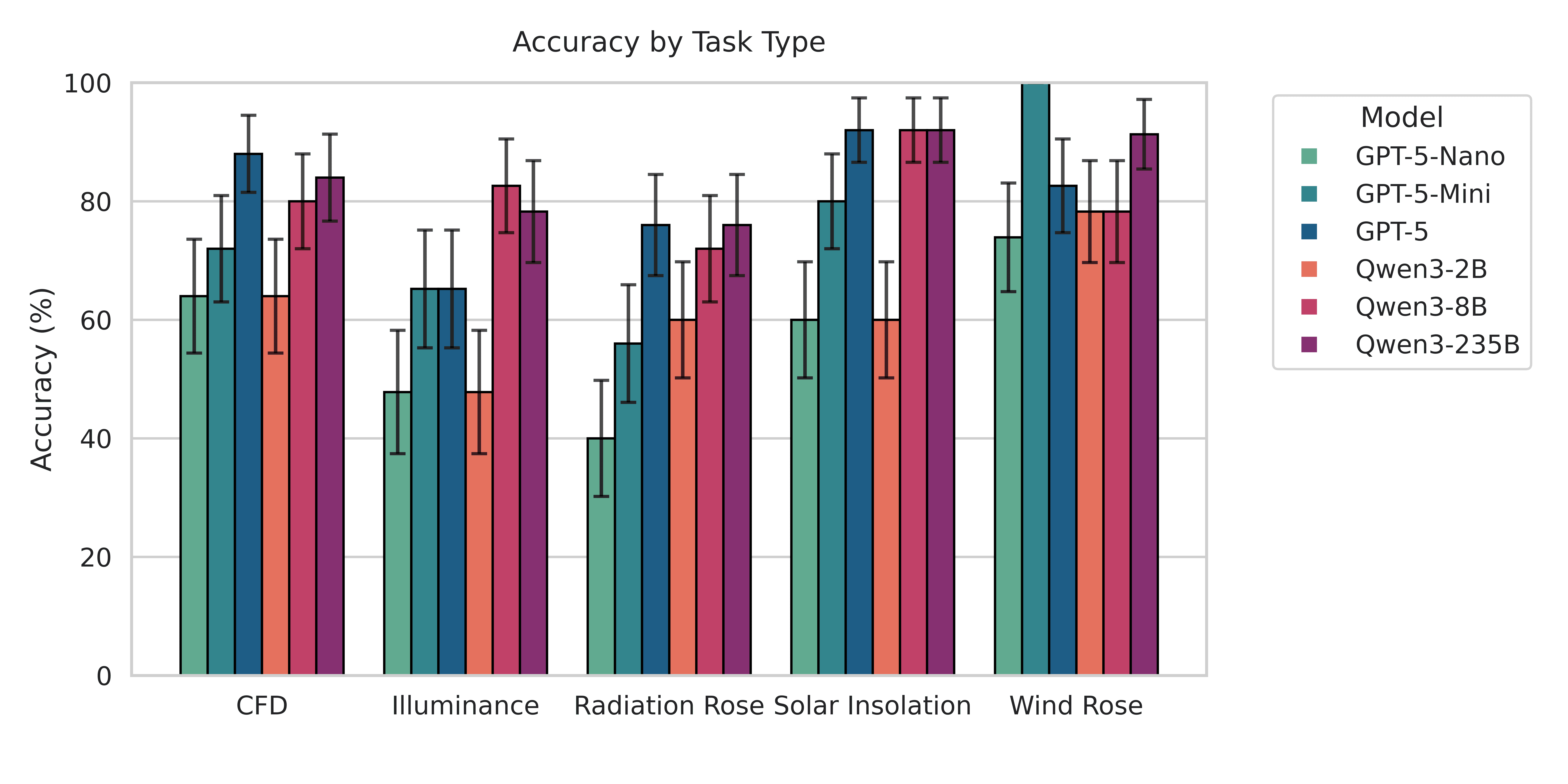 Our evaluation showed performance variations across VLMs in environmental simulation interpretation tasks. Overall accuracy ranged from 57.02% to 84.30%, establishing clear performance hierarchies between model architectures and computational scales as shown in Figure 7. The largest model, Qwen3-235B, achieved the highest accuracy at 84.30%, followed closely by both GPT-5 and Qwen3-8B at 80.99%. Mid-range models GPT-5-Mini (74.38%) and Qwen3-2B (61.98%) demonstrated moderate performance, while GPT-5-Nano, achieved 57.02% accuracy. Performance patterns revealed distinct advantages for larger model architectures in complex visual reasoning tasks. Open source models (Qwen3 series) demonstrated competitive performance with closed-source alternatives (GPT-5 series), with Qwen3-235B surpassing all GPT-5 variants. This finding suggests that architectural simulation interpretation capabilities scale effectively with model size across both proprietary and open-source frameworks, potentially democratizing access to AI-assisted environmental analysis workflows.
